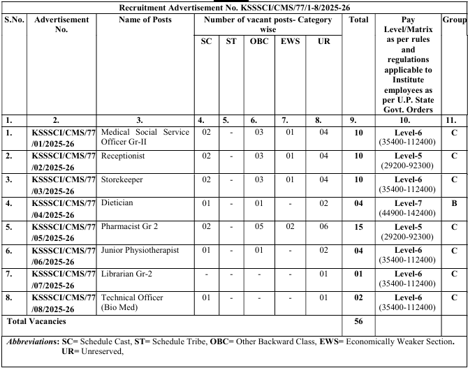 Recruitment Advertisement No. KSSSCI/CMS/77/1-8/2025-26, Dated 19/01/2026